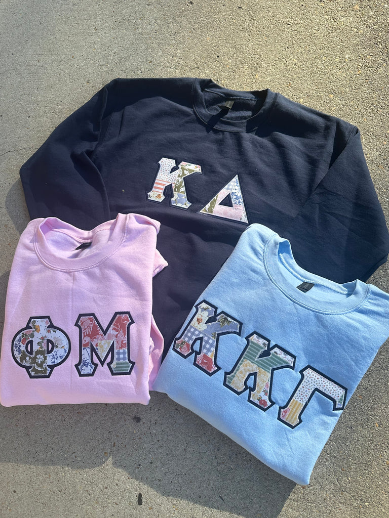 Introducing our on trend fabric lettered sorority patchwork sweatshirts! Available for 20+ organizations. Sweatshirts include 4" sorority letters with patchwork fabric top and navy border. You select the sweatshirt color and size!